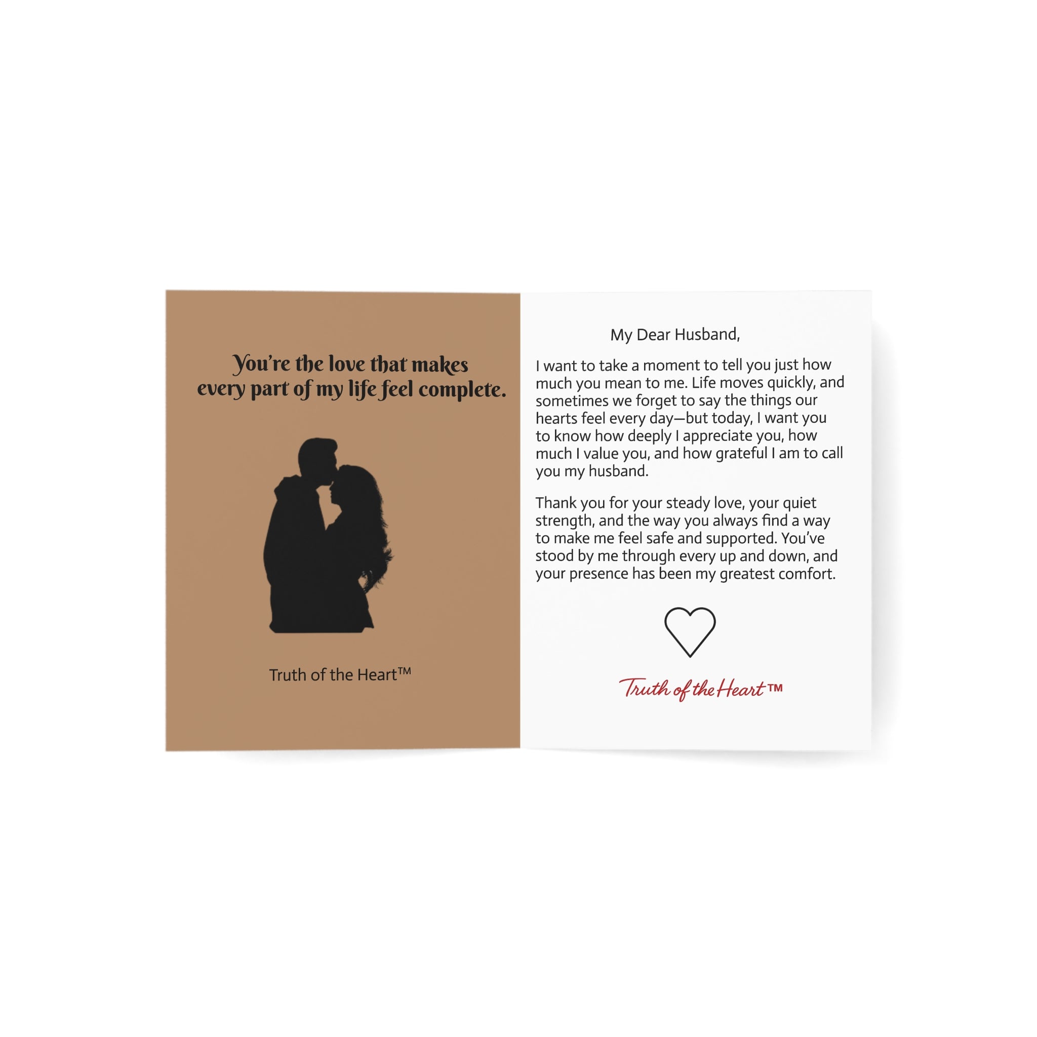 A warm, understated greeting card set made for quiet, heartfelt moments between partners. Each card features a simple silhouetted couple and the words “For Husband” on a soft cream background. The matte finish and vibrant printing give the artwork a gentle, timeless look that reads like a private note.